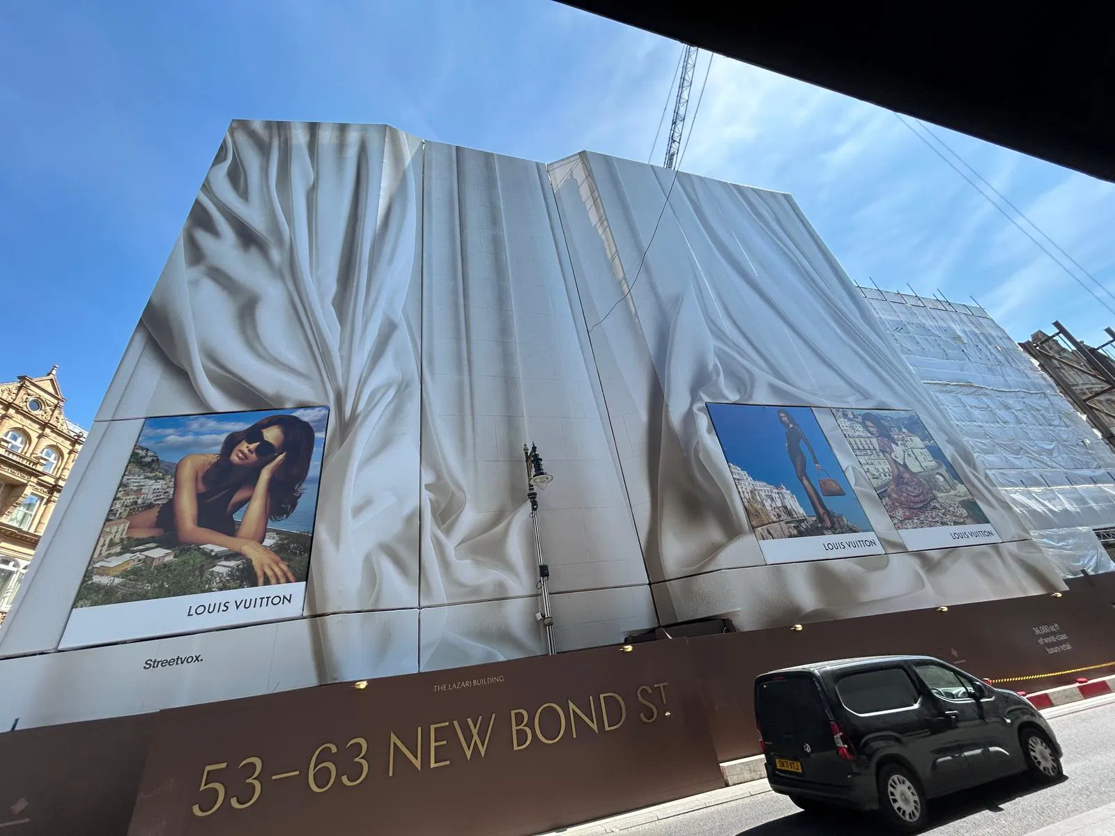 Located in one of London’s most prestigious shopping districts, the New Bond Street project stands out as a truly unique achievement for All Seasons. The scaffolding has been carefully designed to accommodate large-scale advertising banners, featuring world-renowned brands such as Louis Vuitton and Rolex.